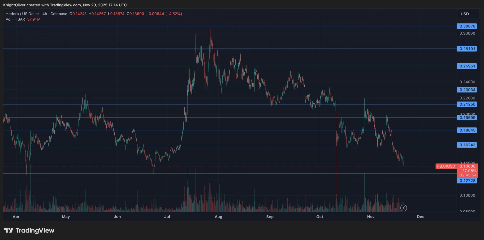 Hedera Hashgraph (HBAR), the native cryptocurrency of the Hedera network, is currently facing significant market pressures that could lead to a major price breakdown if it fails to hold above a critical support level. Investors and traders alike are closely monitoring the asset as it approaches this pivotal point. Here, we delve into the potential implications of this scenario and what it means for the future of HBAR.