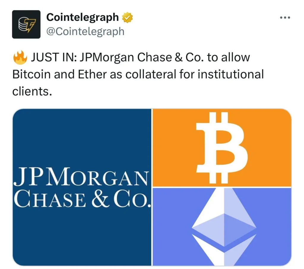In a groundbreaking move by a major traditional financial institution, JPMorgan Chase & Co. has announced that it will start accepting Bitcoin (BTC) and Ethereum (ETH) as collateral for loans. This development is being seen as a significant acknowledgment of cryptocurrency’s growing role in the mainstream financial landscape.