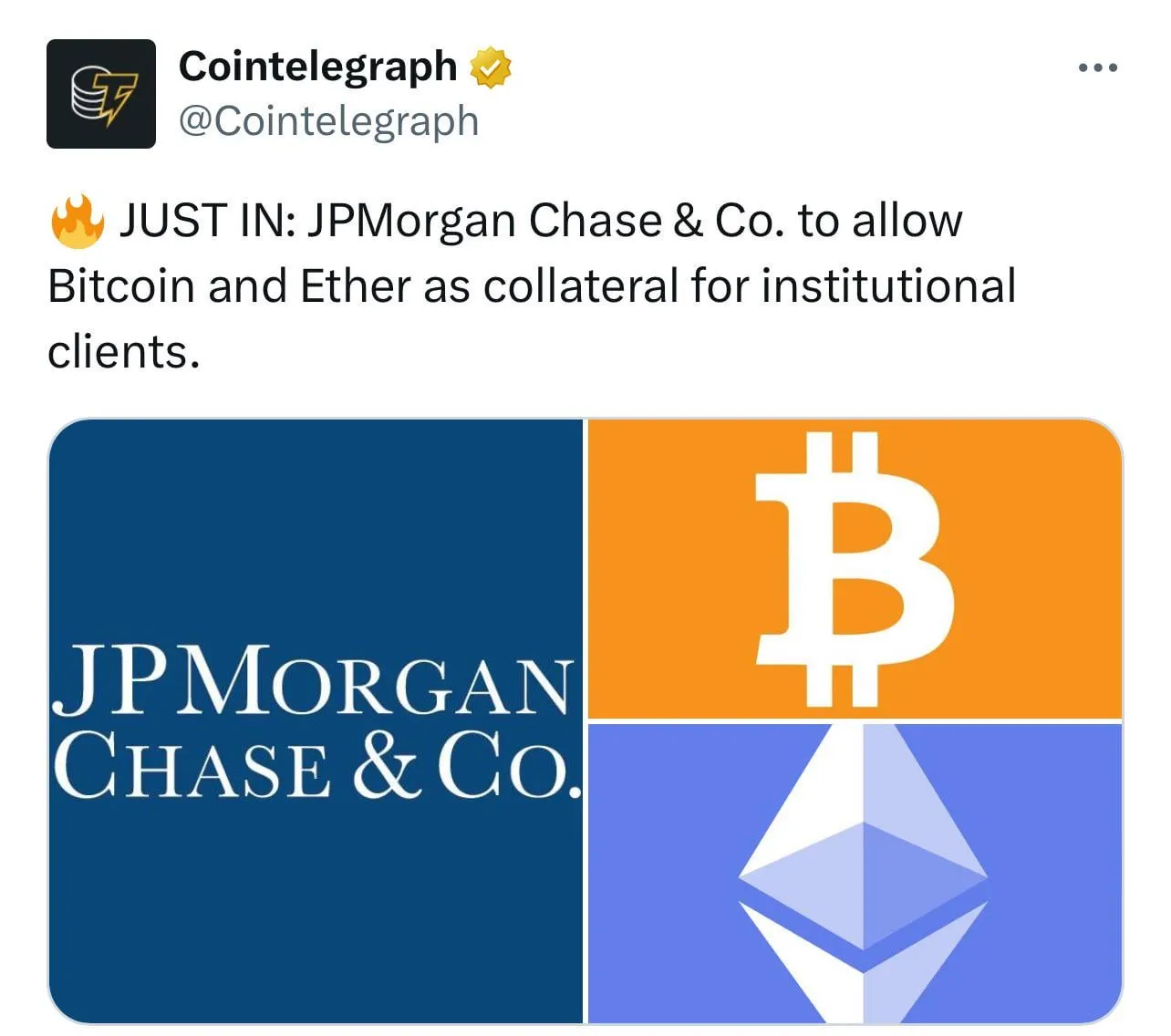 Home»Latest News»JPMorgan Chase to Begin Accepting Bitcoin, Ethereum as Loan Collateral: Report