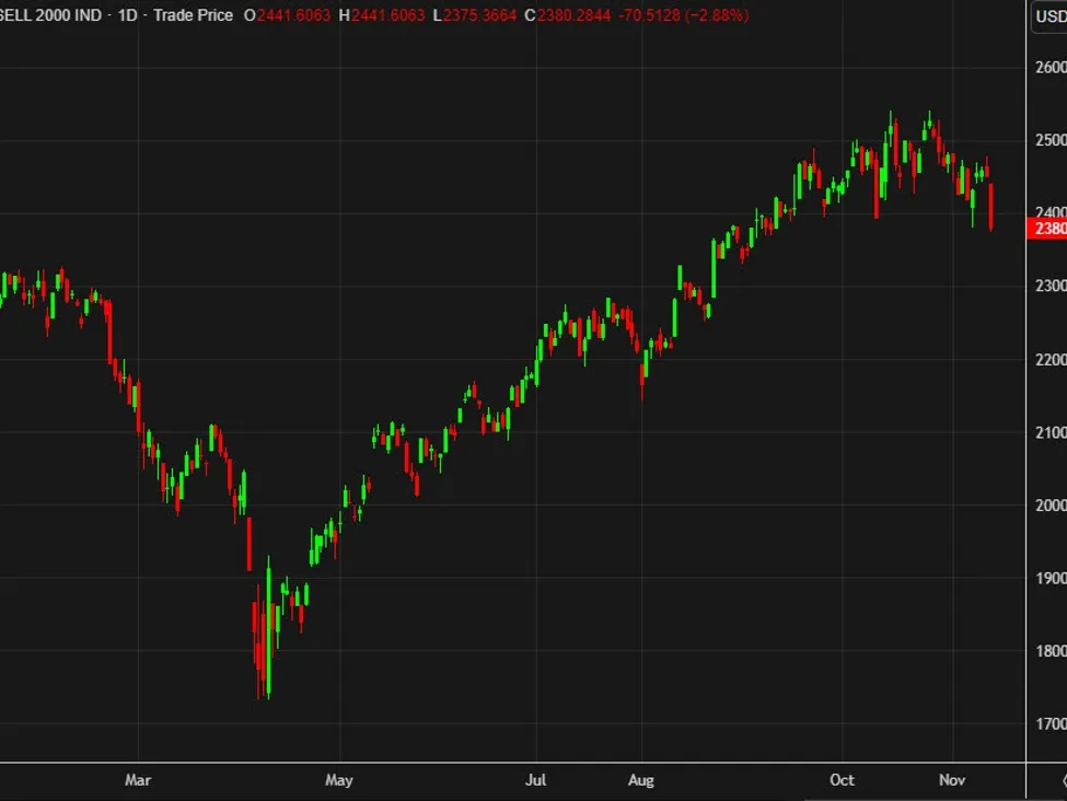 High-growth and internet shares were among the hardest hit. Chegg, Etsy, Snap, and Robinhood slipped on the session, even as Robinhood remains up more than 200% year to date. E-commerce and social platforms including eBay, Bumble, Revolve, and Shutterstock fell roughly 3–4%. Heavier losses were seen in newly public and telehealth names, with Reddit down about 6%, Teladoc off roughly 5%, while Wayfair, Lyft, and MercadoLibre declined between 3% and 4%. AI bellwethers were under pressure as Nvidia led a pullback that dragged the S&P 500 lower by around 1.7% and pushed the Nasdaq down as much as 2% intraday.
