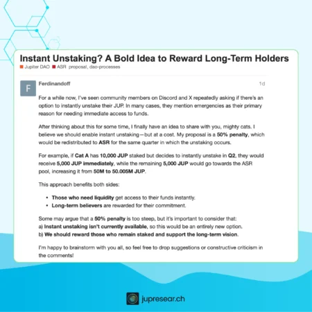 Jupiter has introduced a proposal to implement an instant unstake option for JUP, which would include a 3% fee. This new feature aims to enhance user flexibility and accessibility regarding their JUP holdings. By allowing…