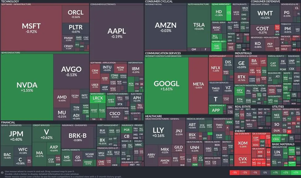 The semiconductor sector led advances, with Nvidia up 1.55% and Lam Research climbing 2.34%, highlighting sustained momentum in AI-driven workloads and capital equipment spending. The strength in chips contrasted with softer performance across the wider technology complex. Microsoft slipped 0.92% and Oracle eased 0.56%, reflecting valuation sensitivity and selective profit-taking outside the chip space.