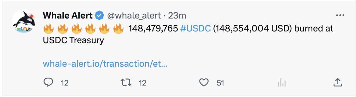 USDC Treasury Burn 50,000,000 USDC Ethereum Whale Alert